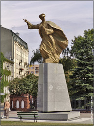 Nieudany pomnik. Wzniesiono go naprzeciw kościoła św. Floriana, dzieła architekta Józefa Piusa Dziekońskiego. Postać bohaterskiego księdza w interpretacji artysty Renesa przypomina tu wiejskiego głupka pytającego o drogę a nie żołnierza, przelewającego krew za Ojczyznę. Odlana w brązie figura, oglądana z różnych stron, może przywodzić na myśl różnorakie skojarzenia - od dzieł socrealizmu po rzeźbę lwowska z kręgu Pinsla i Osińskiego. Kontrowersyjne dzieło najlepiej prezentuje się ... pod słońce.